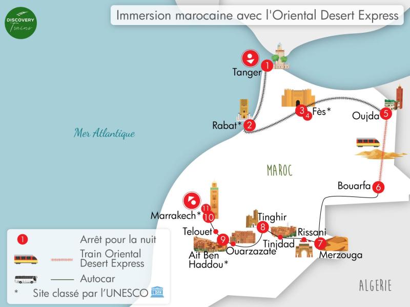 Après le petit-déjeuner matinal, la journée est consacrée au train du désert reliant Oujda à Bouarfa : ce voyage exceptionnel n'a lieu que 3 à 4 fois par an. L'Oriental Désert Express traverse l'immensité des steppes de la vallée de l'Orient, des paysages fantastiques vous attendent sur cette ligne Oujda - Bouarfa construite entre 1925 et 1931. En voici les étapes :