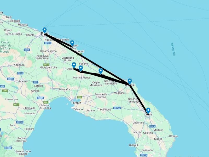 - Transport en voiture ou minibus pour la découverte de Alberobello, Ostuni et Locorotondo (groupe de 8 personnes maximum).